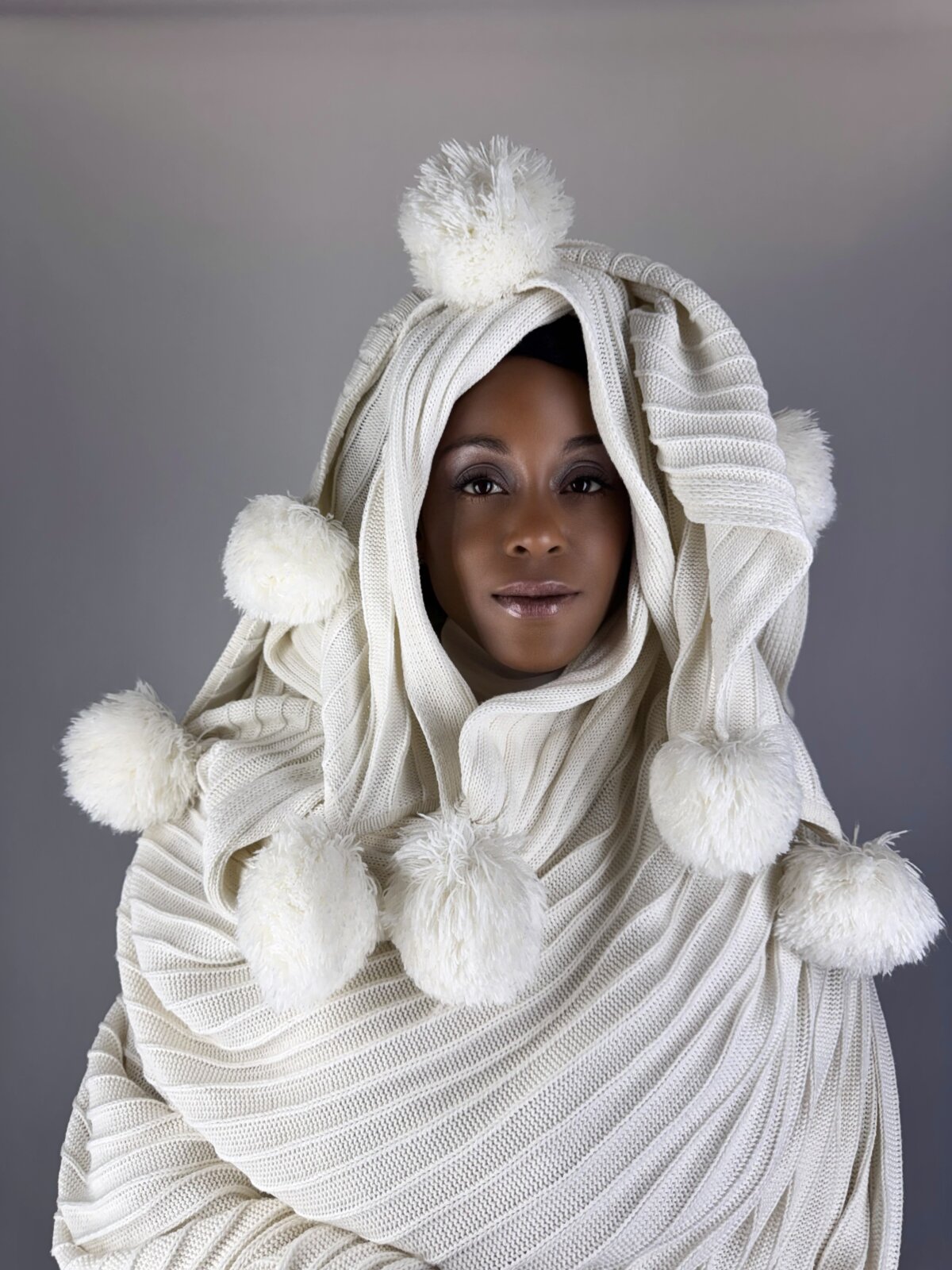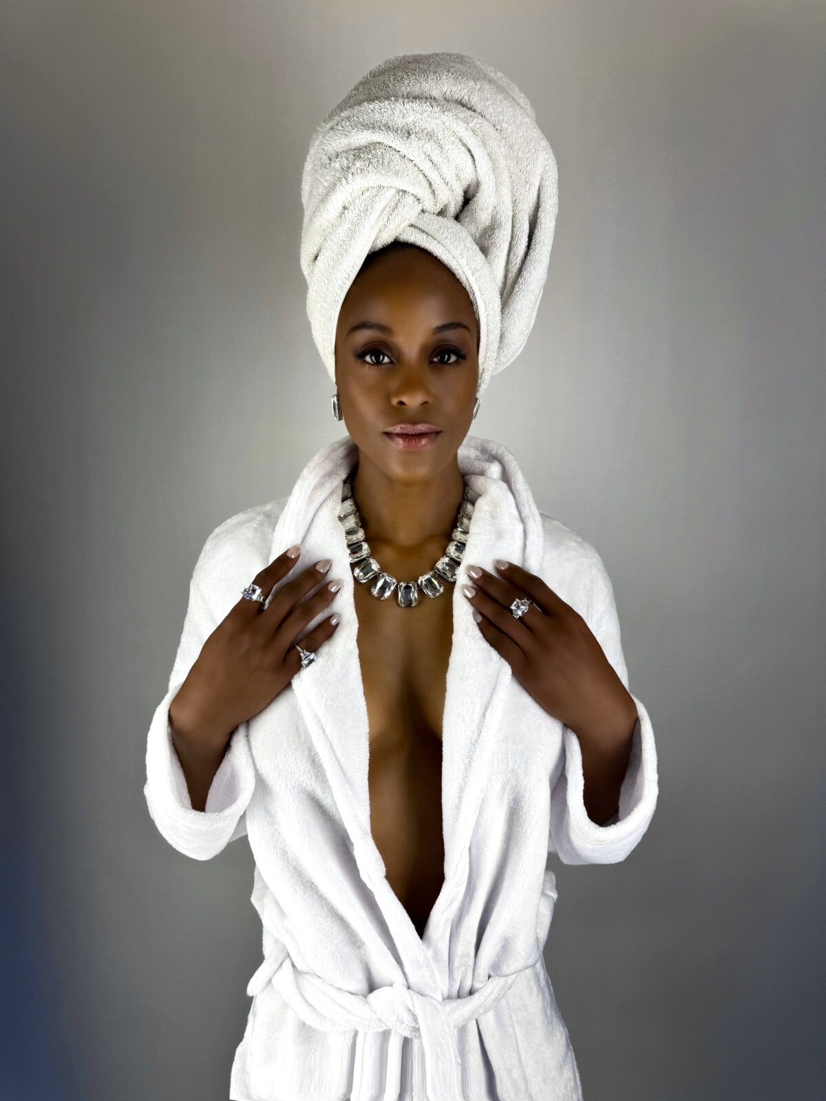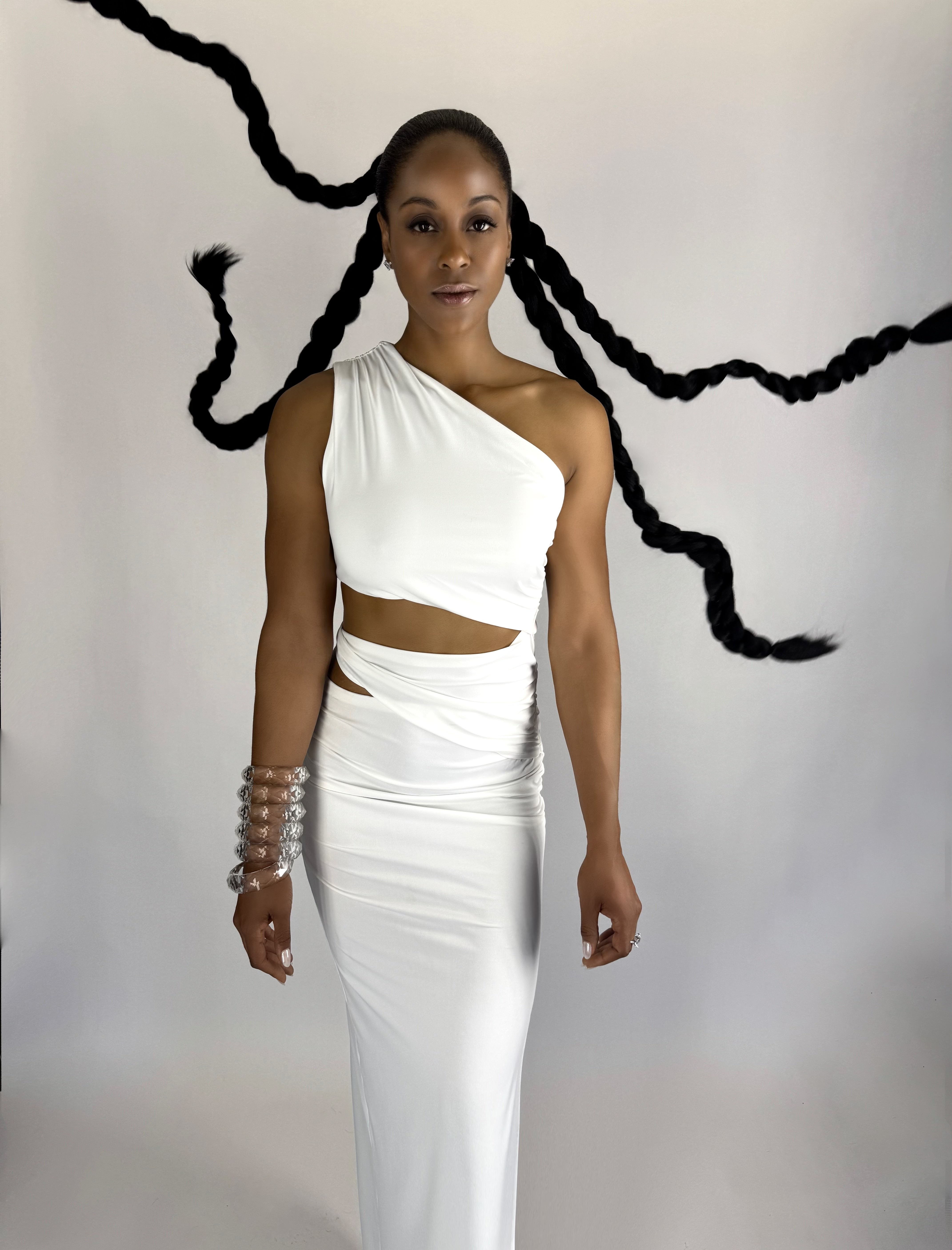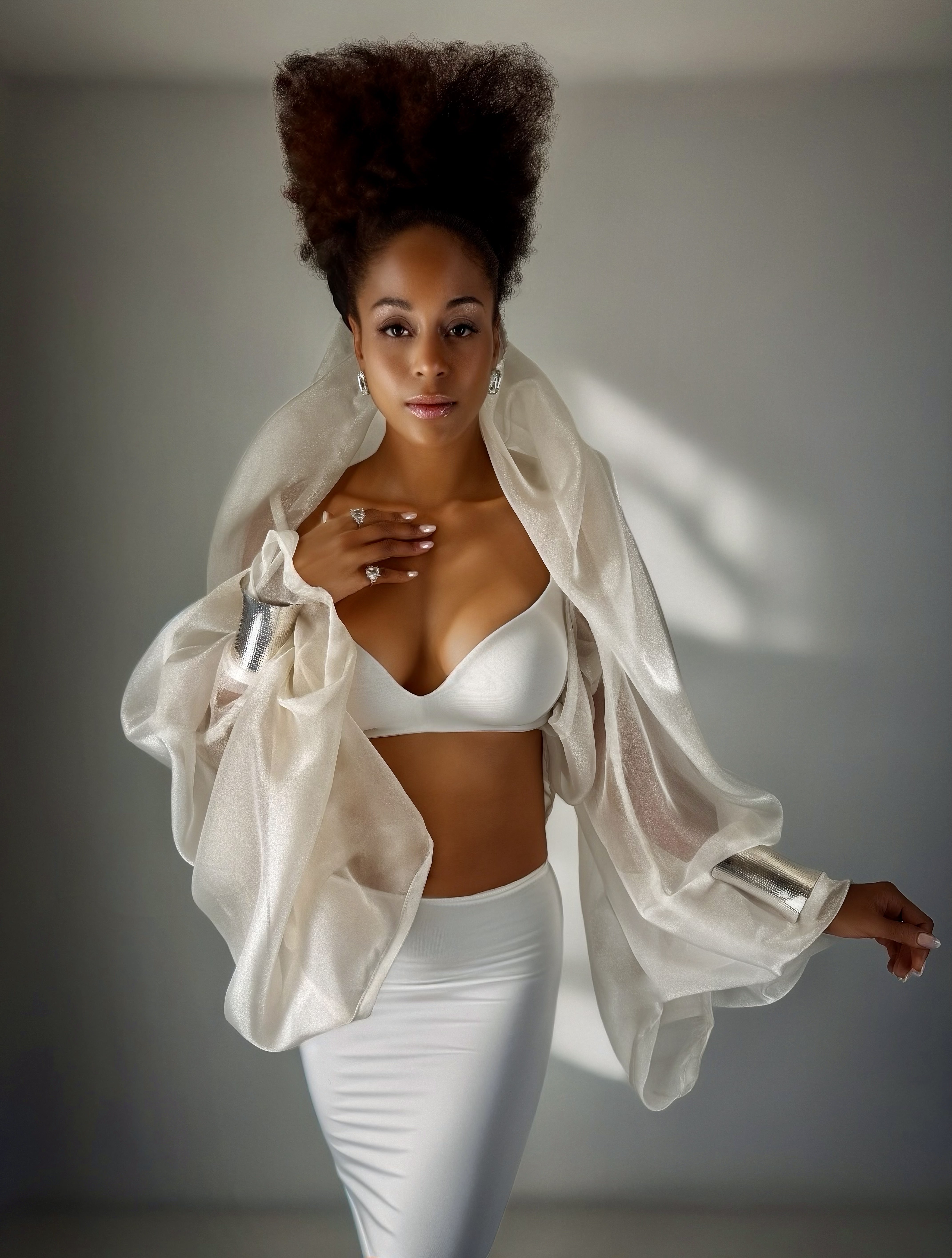 The model moves through each frame as both muse and sculptor, her presence commanding yet graceful — whether caught in profile with a cascading braid that echoes the clean lines of her silhouette, crowned in voluminous natural texture that defies gravity with regal confidence, or suspended in a moment of balletic poise where her body becomes pure gesture.